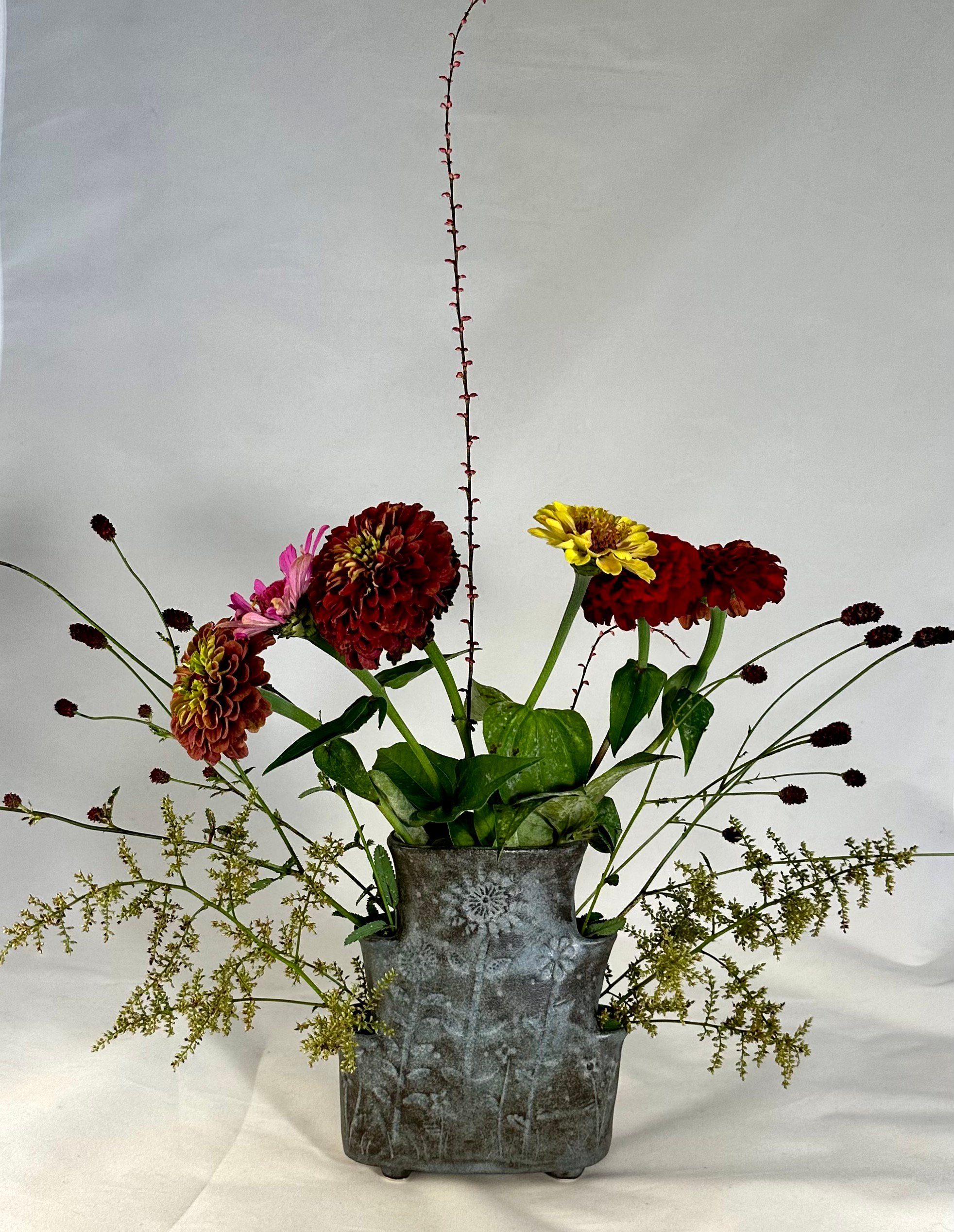Beautiful glaze with a blue fog around the flowers. Stoneware, 4 pockets for a more expansive bouquet. 6" tall, 5" wide