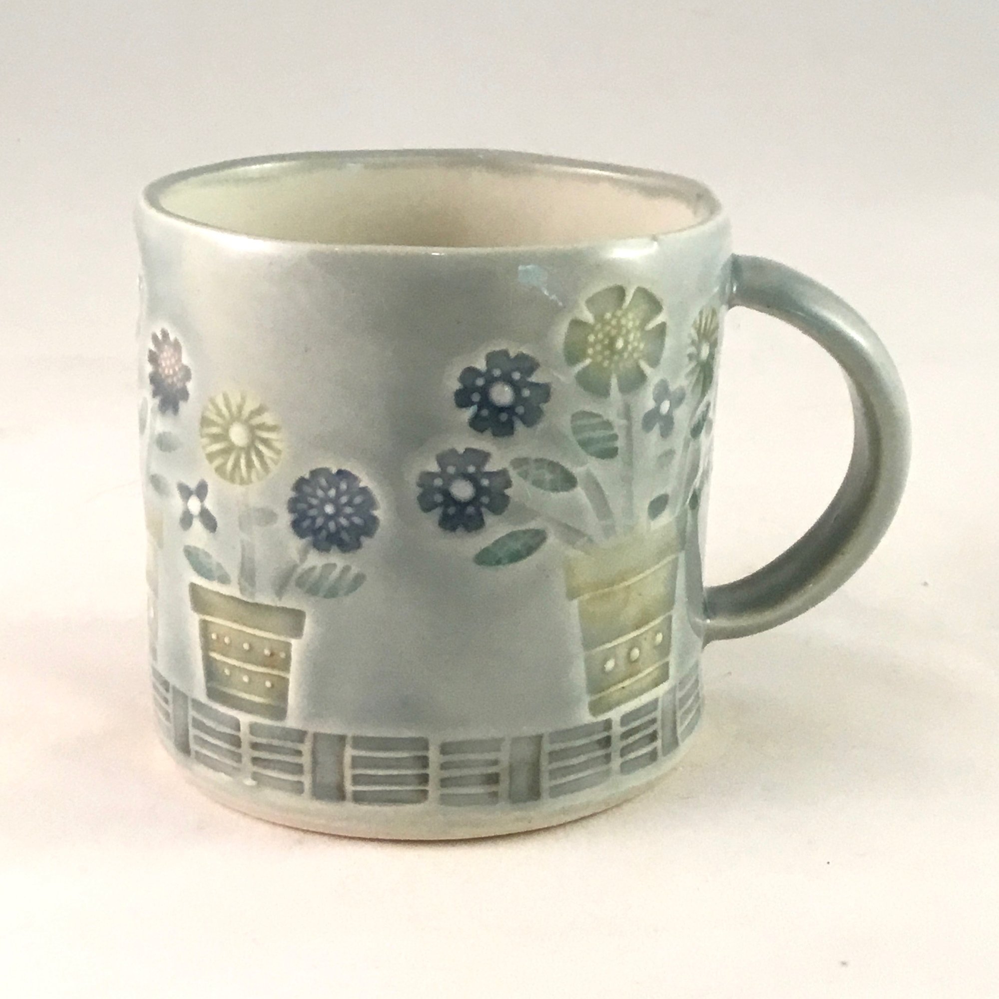 Stoneware mug stamped with flower pots full of flowers 4" tall, 3.5" wide (5" including handle). 8 oz